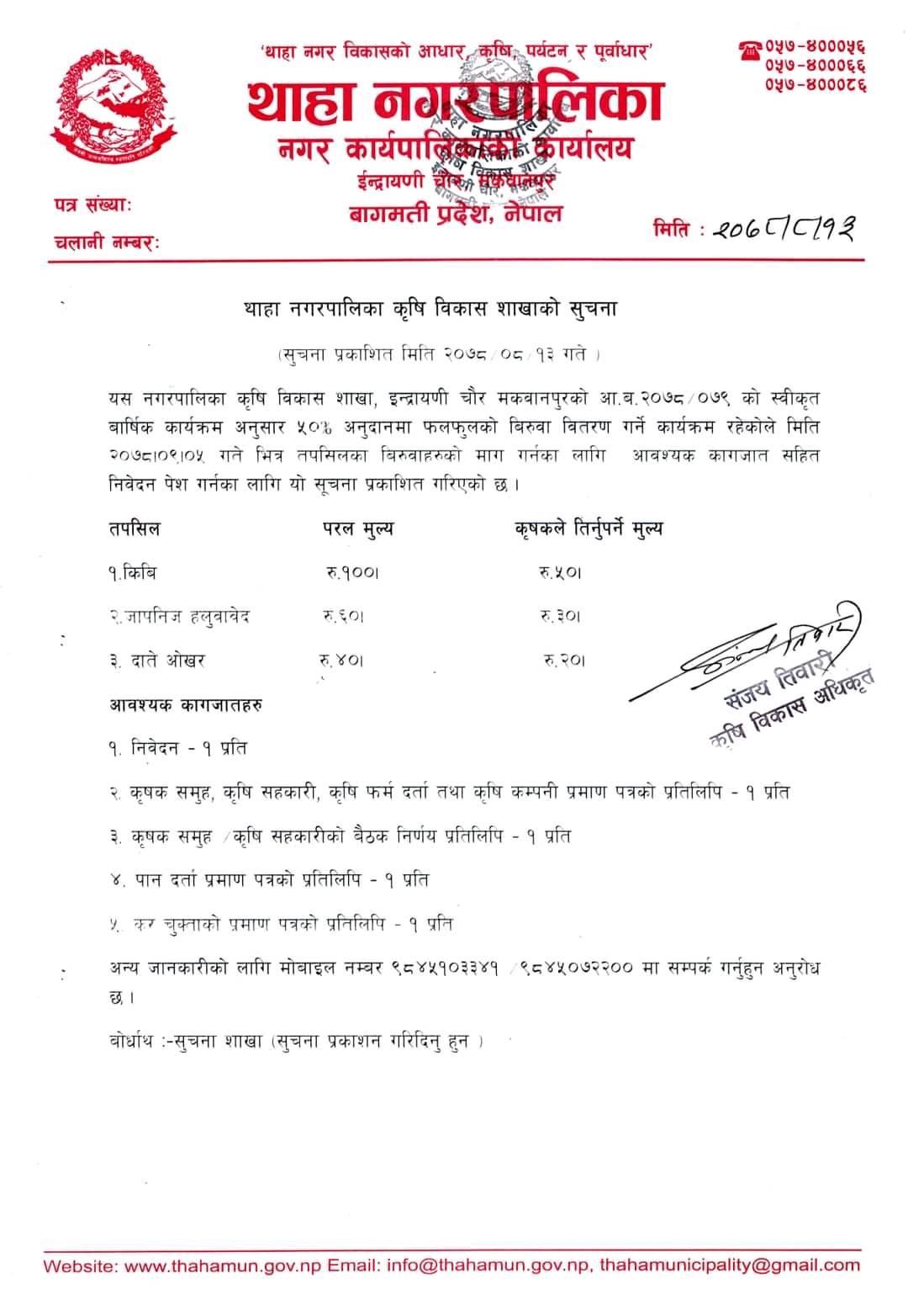कृषि विकास शाखा थाहा नगरपालिकाले आ.व. ०७८/०७९ को स्वीकृत बजेट अनुसार विभिन्न जातका फलफूलका विरुवा अनुदानमा वितरण गर्ने भएको छ ।