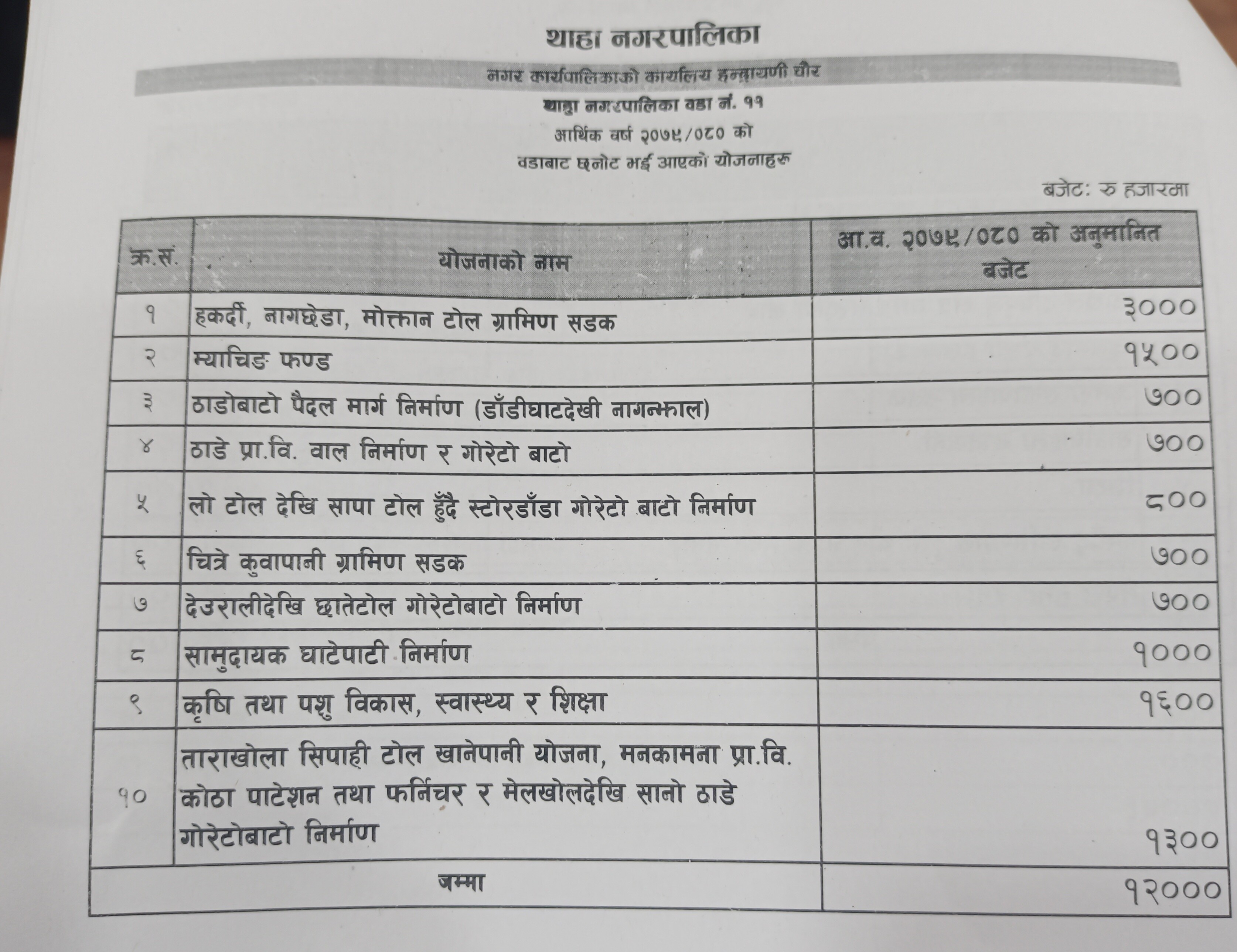 वडागत योजना र तिनका लागि विनियोजित बजेट