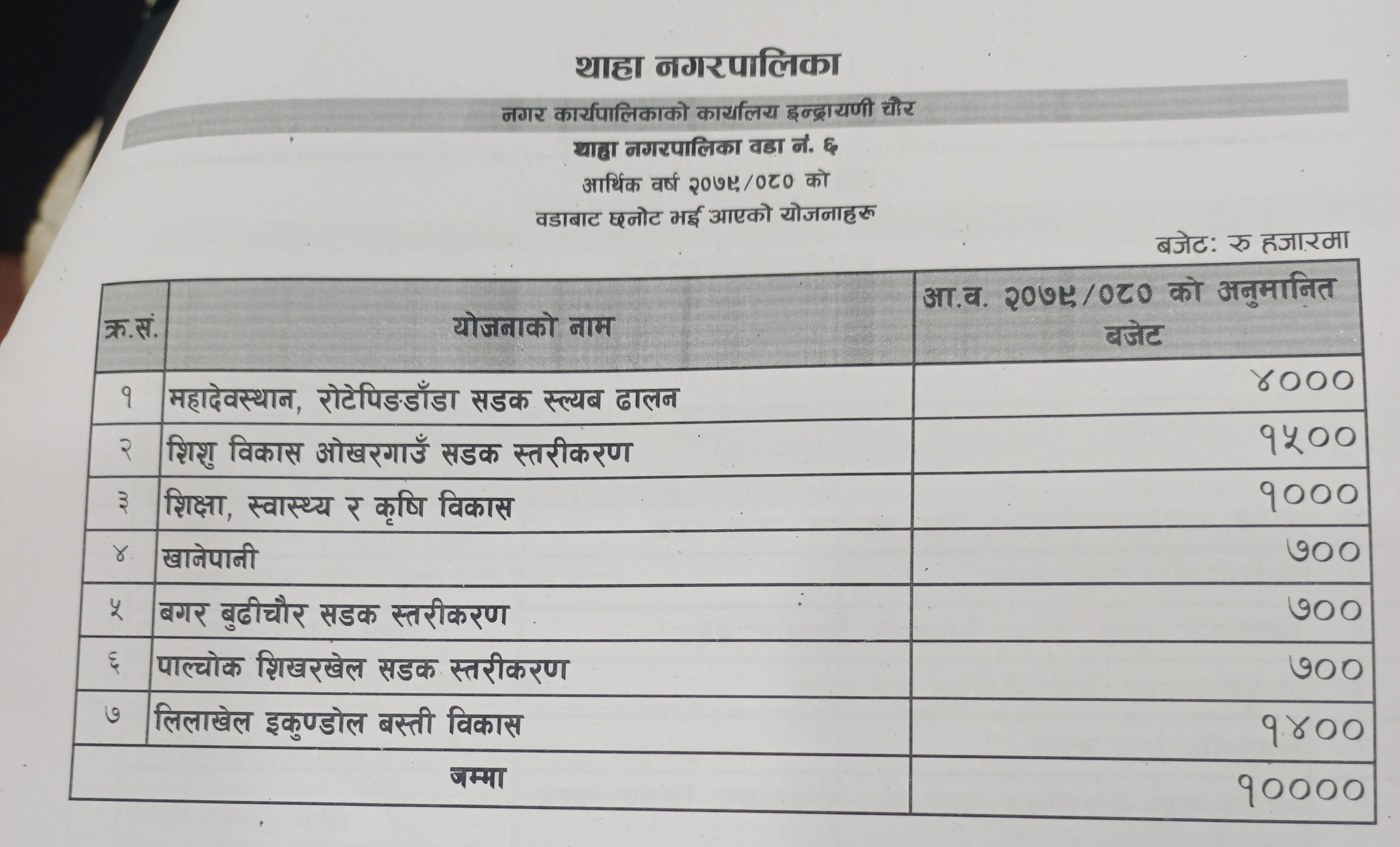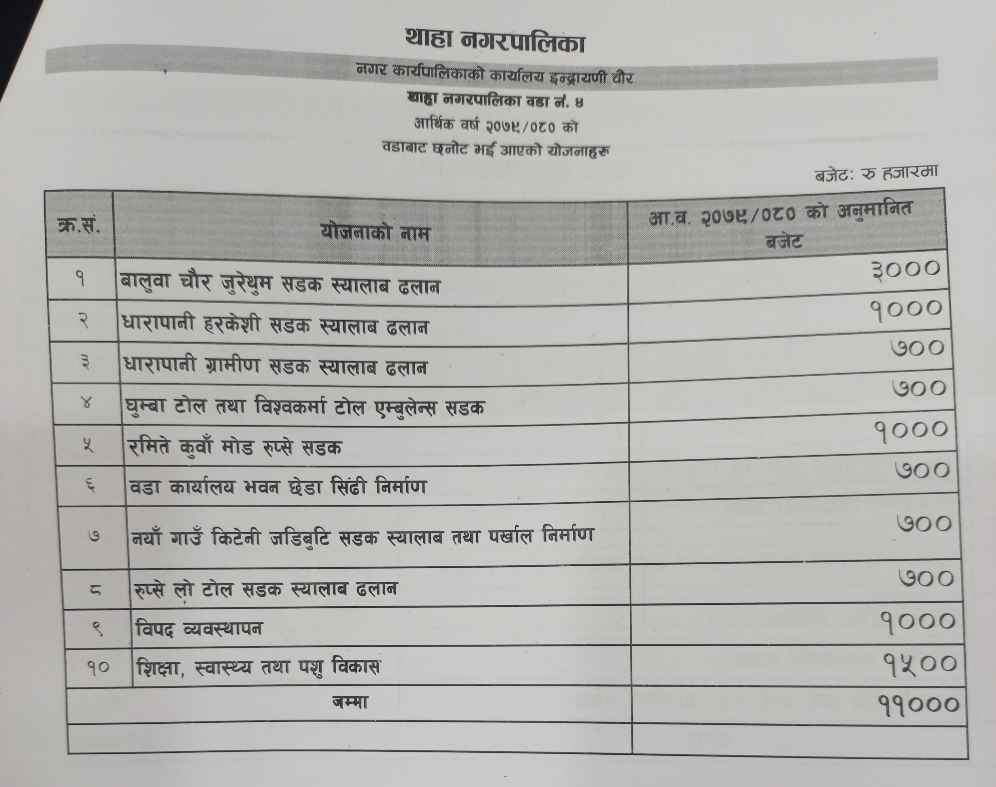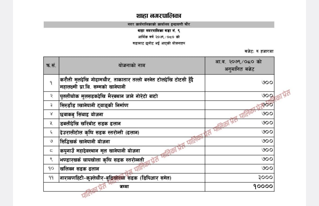 नगर प्रमुख बिष्णु बहादुर विष्टको अध्यक्षतामा भैरहेको सभामा नगर उपप्रमुख भरत गोपालीले कुल अर्ब ८ करोड ८४ लाख ७ हजार रुपैयाँको अनुमानित आय प्रस्तुत गरेका छन् । प्रस्तुत बजेटमा चालु खर्च ९ करोड ९७ लाख ५४ हजार, पुजिगत खर्च ५१ करोड ७२ लाख १३ हजार, विषयगत कार्यालय सशर्त अनुदान ३२ करोड १४ लाख ४० हजार र सामाजिक सुरक्षा तर्फ १५ करोड खर्चको अनुमान गरिएको छ ।