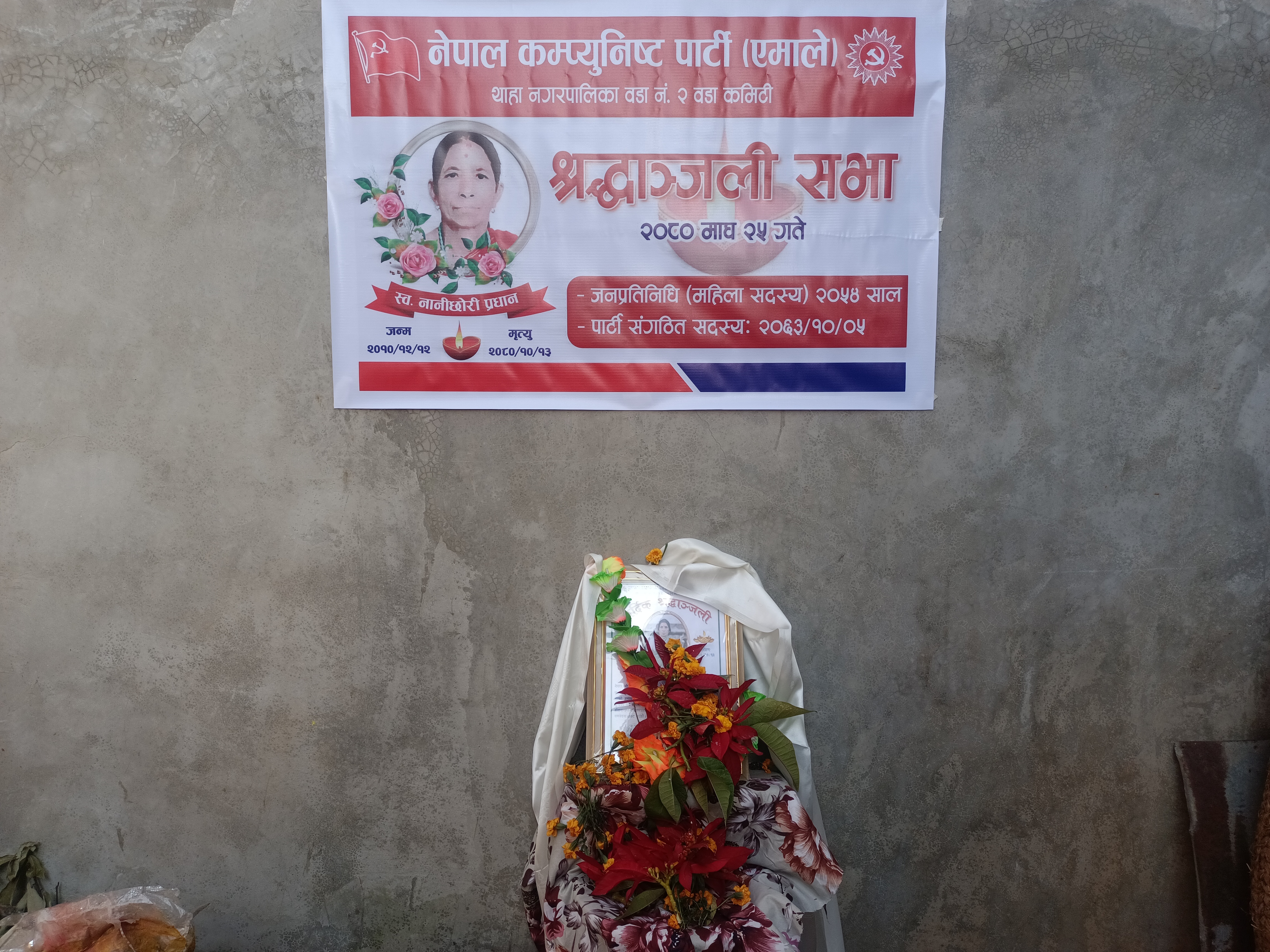 नेकपा एमाले २ नम्बर वडा कमिटीले तत्कालीन पालुङ गाविसमा जनप्रतिनिधि नानीछोरी प्रधानको निधन भएको तेह्रौं दिनको पुण्यतिथिमा बिहीबार श्रद्धाञ्जली अर्पण गरेको हो ।