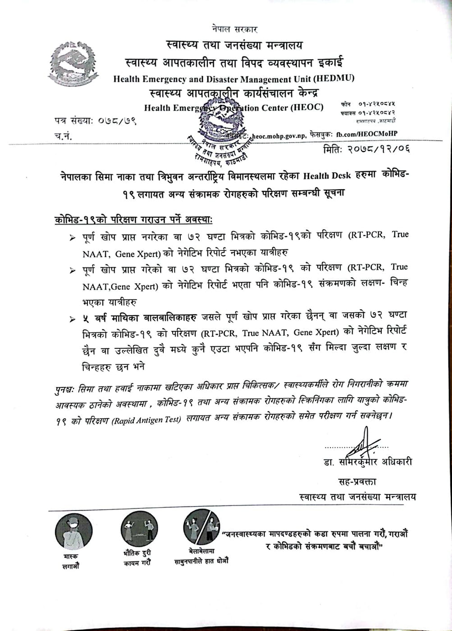 स्वास्थ्य तथा जनसंख्या मन्त्रालयका सहप्रवक्ता डा. समिरकुमार अधिकारीले हेल्थ डेस्कहरुमा कोभिड १९ को पूर्ण खोप नलगाएका र कोभिड—१९ संक्रमणसँग मिल्दोजुल्दो लक्षण देखिएकाको मात्र स्वास्थ्य परीक्षण हुने जानकारी दिए ।